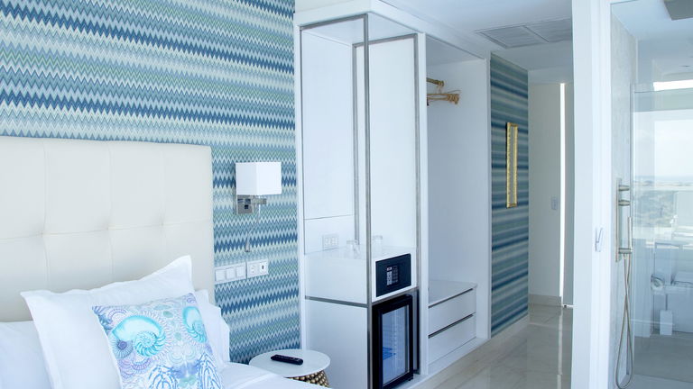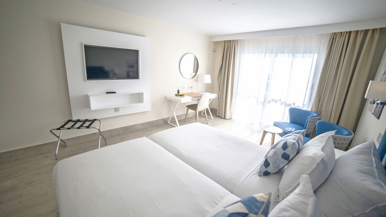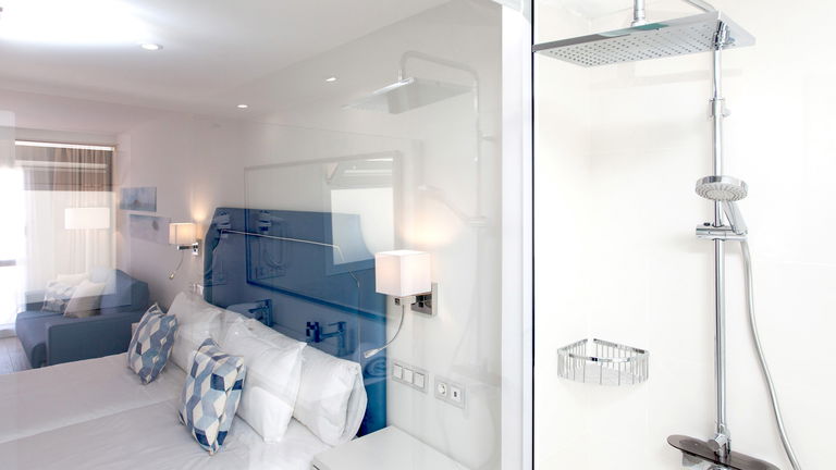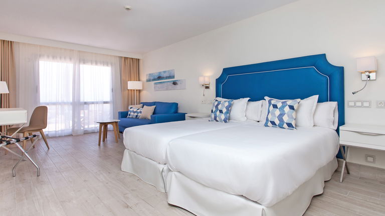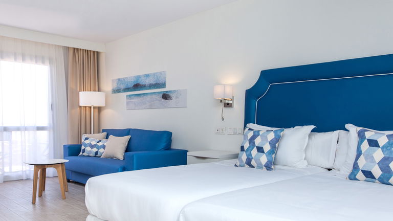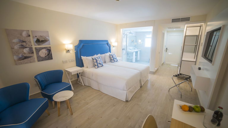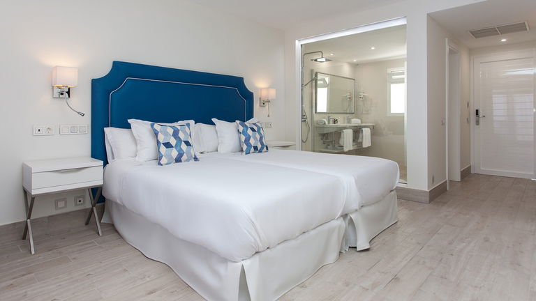 Nuestras habitaciones con vistas al mar y a la Dunas de Corralejo destacan por su decoración en blanco y añil y su suelo cerámico con efecto madera que aporta frescura y elegancia. La iluminación indirecta, da calidez al ambiente y sobre todo destaca la luz natural.