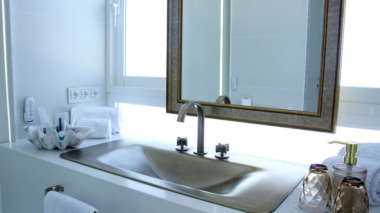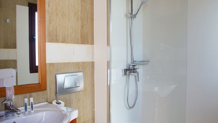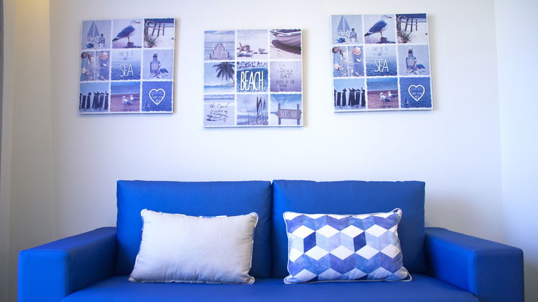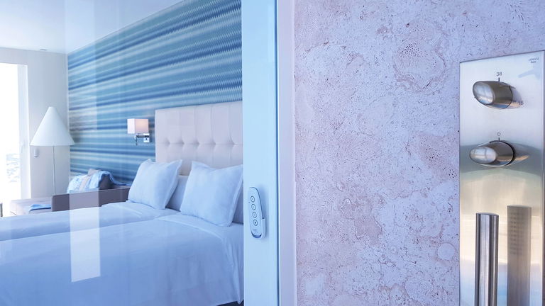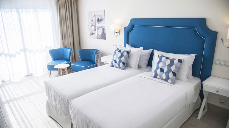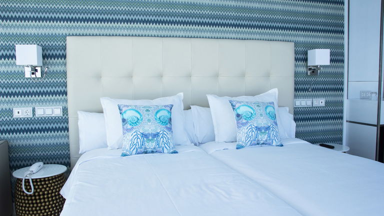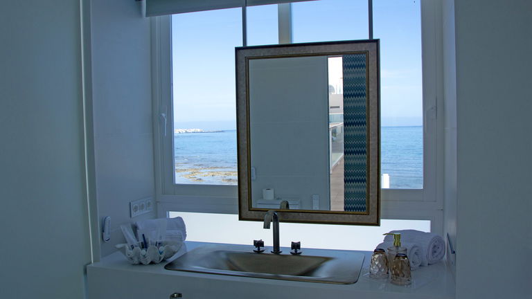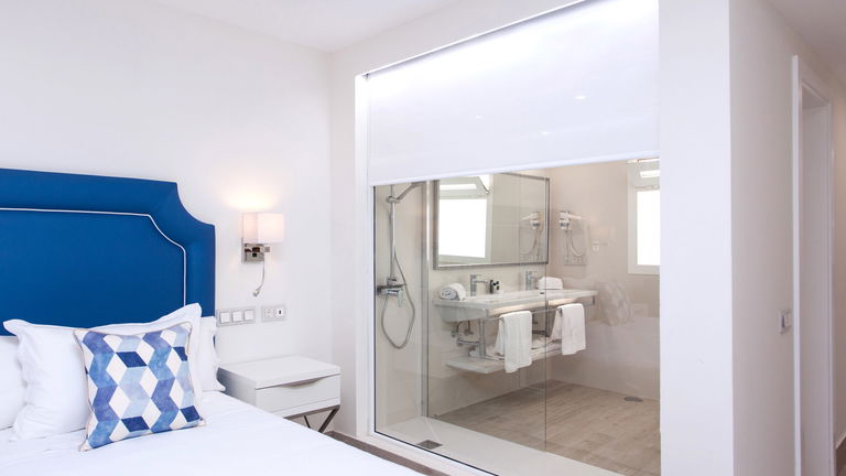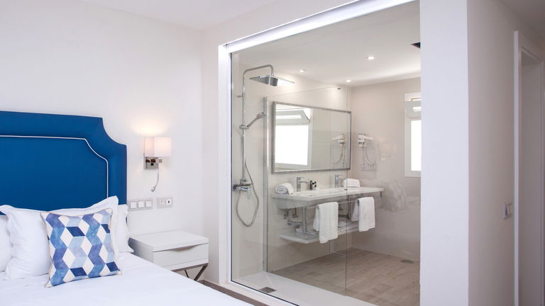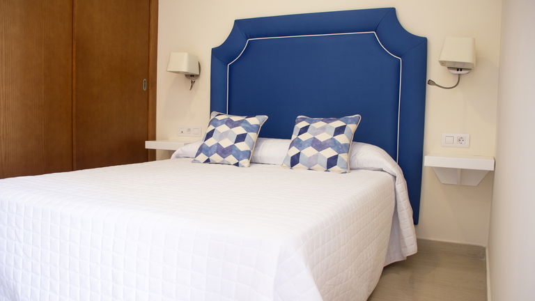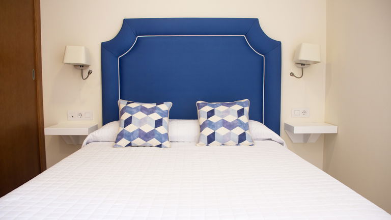 Nuestras habitaciones destacan por su decoración en blanco y añil y su suelo cerámico con efecto madera que aporta frescura y elegancia. La iluminación indirecta, da calidez al ambiente y sobre todo destaca la luz natural.