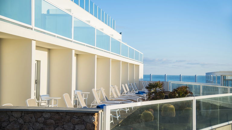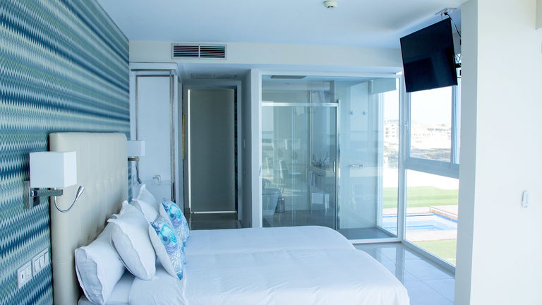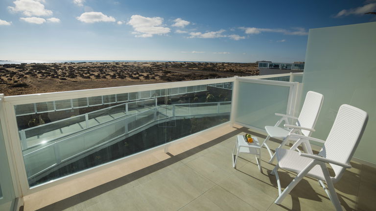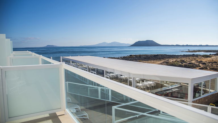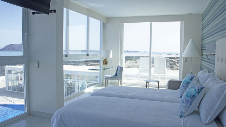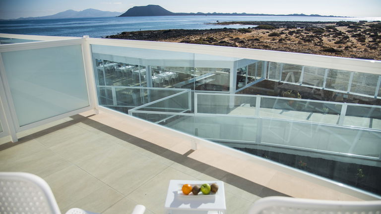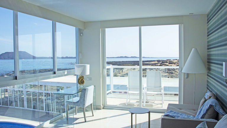La Suite totalmente acristalada con vistas al mar, la isla de Lobos y Lanzarote es un espacio ideal para garantizar unas vacaciones de altas calidades.
