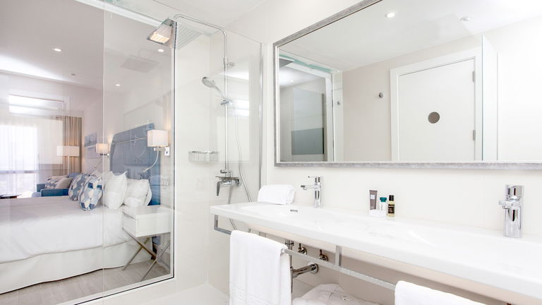 Destacar el amplio baño acristalado, los juegos de toallas premium, amenities, secador de pelo, espejo de aumento y plato de ducha con mampara de cristal.